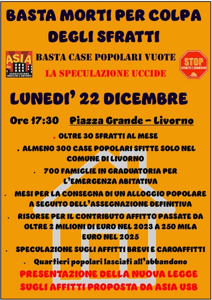Due suicidi in un mese in Toscana per colpa degli sfratti. Due persone disperate abbandonate dalle istituzioni che hanno deciso di togliersi la vita. Numeri sempre più preoccupanti anche a Livorno con sfratti e pignoramenti in crescita e centinaia di famiglie in attesa di un alloggio.