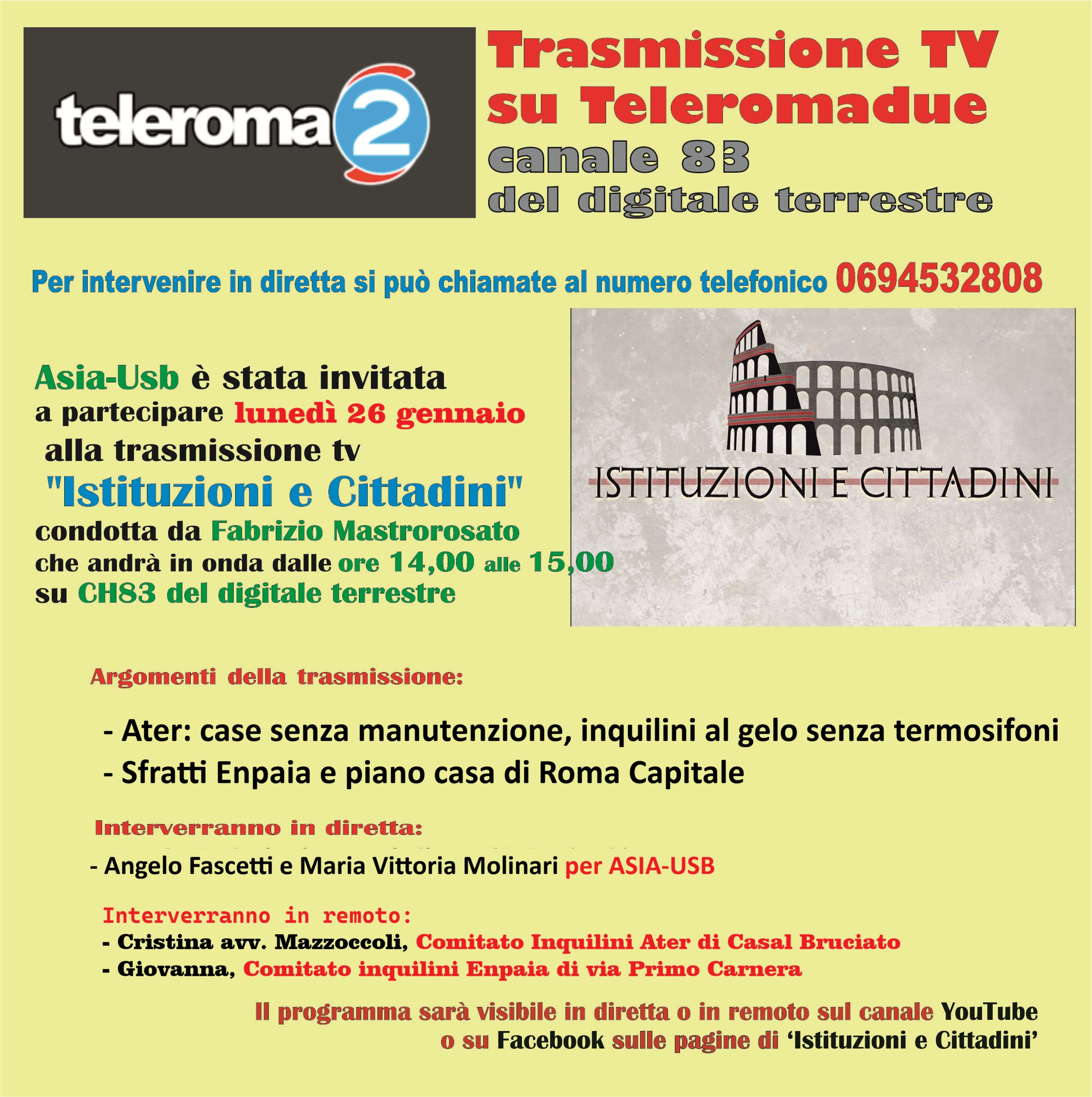 Asia-Usb è invitata a partecipare alla trasmissione tv "Istituzioni e Cittadini" condotta da Fabrizio Mastrorosato sul tema del diritto all'abitare.