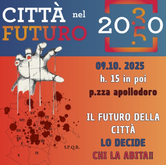 Da parte nostra, chiamiamo tutte quelle realtร e persone indisponibili a farsi schiacciare da questi processi a raccolta giovedรฌ 9 dalle ore 15 in poi a piazza Apollodoro in contemporanea all'inizio del panel "Cantiere Roma: le sfide di una Capitale". Facciamoci sentire: il futuro della cittร lo decide chi lo abita!