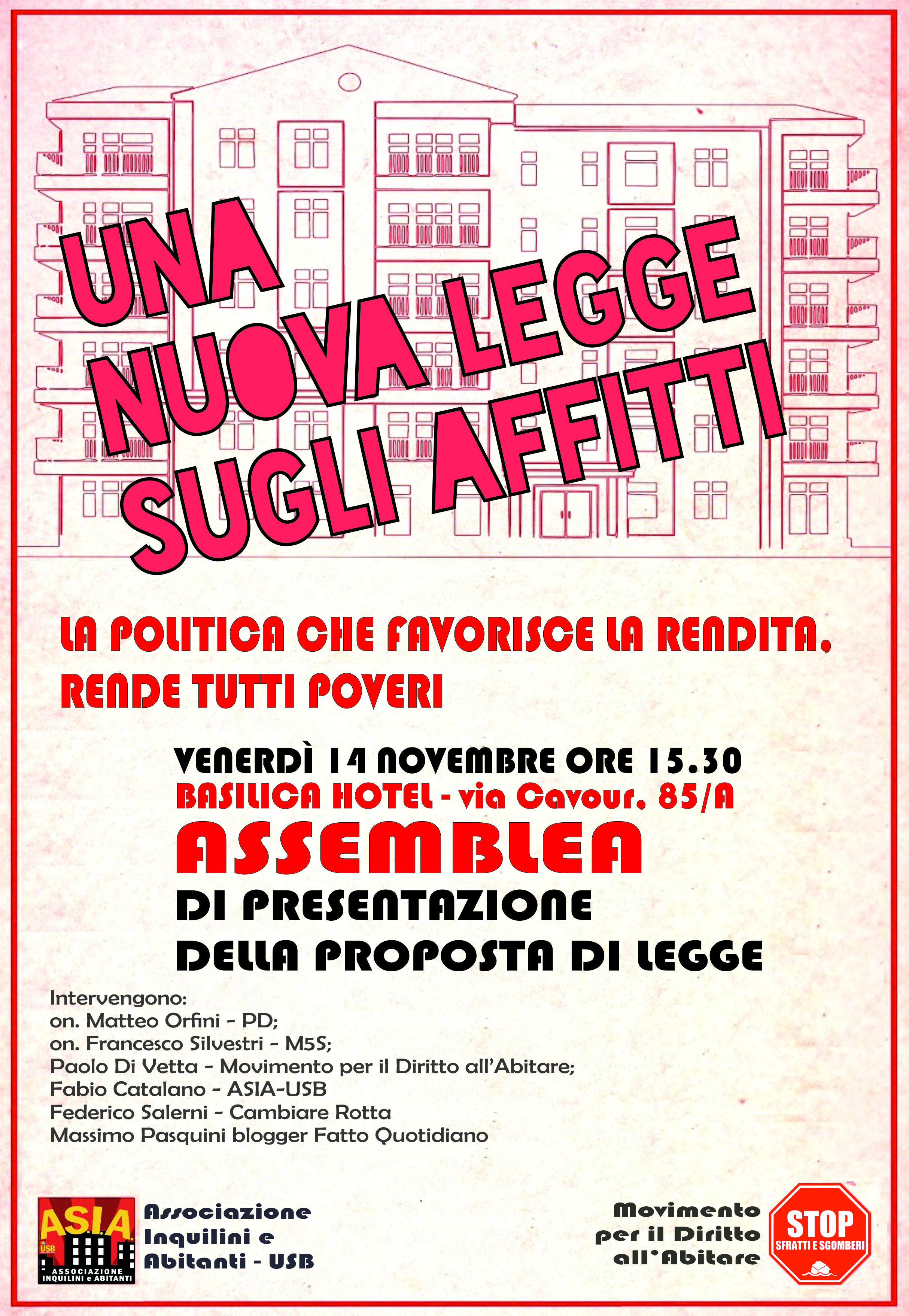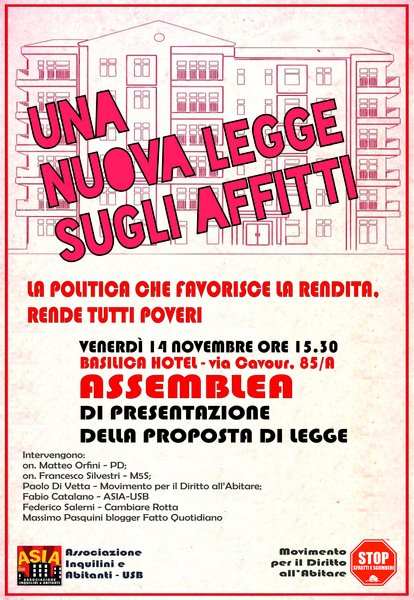 ASSEMBLEA CITTADINA: PRESENTAZIONE DELLA PROPOSTA DI LEGGE PER UN CANONE EQUO, PER BLOCCARE SFRATTI, SGOMBERI E PIGNORAMENTI - Venerdì 14 novembre h.15.30 - Basilica Hotel & Congressi [via Cavour, 85/A]