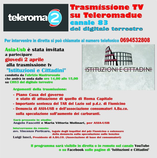 Asia-Usb è ancora invitata a partecipare alla trasmissione tv "Istituzioni e Cittadini" di giovedì 2 aprile condotta da Fabrizio Mastrorosato sul tema del diritto all'abitare.